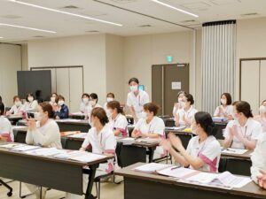 指導者会議には、副院長・教育担当看護部長をはじめ、実習病棟すべての師長・実習指導者が参加していただいています。各学年ごとの実習の目標や方法の違いなどを共有し、大警看の学生の皆さんにとって、よりよい学びを目指しています。
